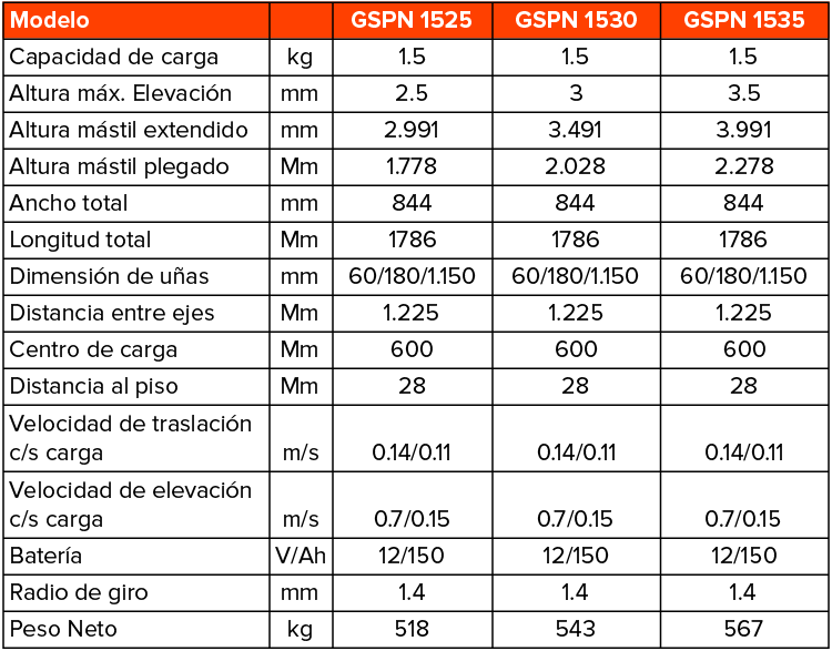 Los apiladores Serie GSPN son equipos sólidos, con elevación electrohidráulica y traslación manual.