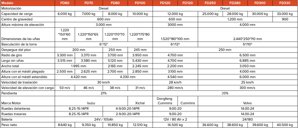 La serie pesada de autoelevadores a combustión Diesel, de la marca Goodsense, cargan de 6 a 33 toneladas.